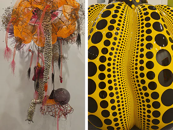 In a curious but effective juxtaposition, the same gallery also presented the iconic pumpkin by Yayoi Kusama in fiberglass reinforced plastic. While Kusama’s visual language is globally ubiquitous, here it functioned almost as a counterpoint — a polished, pop-inflected meditation against Banerjee’s layered materiality.