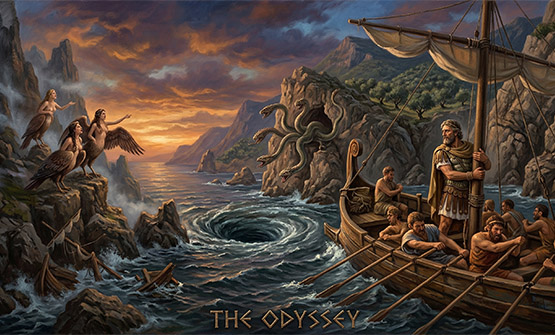 This is the legendary tale of Odysseus’ long journey home—full of monsters, gods, and temptation. Where the Iliad is contained within the chaos of war, the Odyssey stretches outward—into oceans, islands, and the unpredictable terrain of the self. Odysseus is not just trying to return home; he is being tested, again and again, on whether he still deserves it.