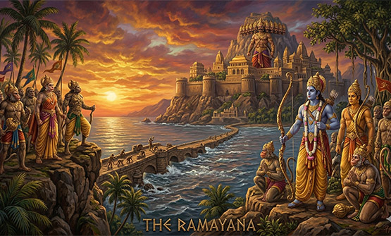 In the Hindu tradition, the Ramayana is believed to be set in the Treta Yuga, one of the four cosmic ages. This places the story thousands (even lakhs) of years ago, in a sacred, non-historical timeframe. Attributed to Valmiki it was composed roughly between 500 BCE – 100 BCE. Evolved over time through oral storytelling before being written down in Sanskrit.