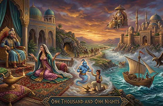 The famous frame story of Scheherazade likely emerged during this phase. Later Expansion & Global Fame Introduced to Europe in the 18th century through translation by Antoine Galland. Storytellers added some of the most famous tales—like Aladdin and Ali Baba—later, which did not appear in the earliest Arabic manuscripts.
