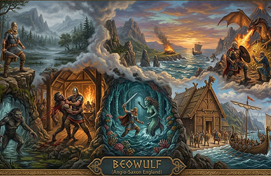 A heroic tale (c. 8th–11th century) of monster-slaying and mortality, central to early English literature.