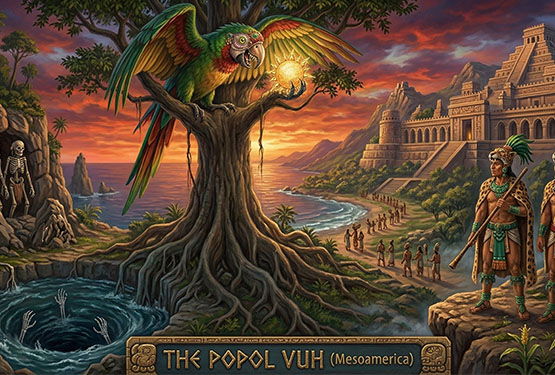 The sacred text of the Kʼicheʼ Maya, narrating creation myths and the adventures of the Hero Twins in the underworld. If many ancient stories look upward—to gods, to heavens—the Popol Vuh turns downward, into the underworld, where trials are not just physical, but psychological and symbolic. At its centre are the Hero Twins, who descend into Xibalba, a realm filled with traps, illusions, and tests designed to break them.