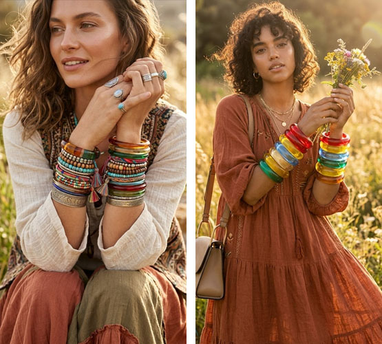 In boho-inspired looks, these bangles find a natural home. Layered with beads, threads, and metallic cuffs, they add colour, rhythm, and movement. Imperfection becomes part of the aesthetic. This is where they look most resilient—unstructured, expressive, and personal.