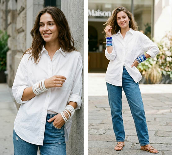 Think effortless, everyday dressing—linen kurtas, oversized shirts, or even a basic white tee and jeans. A few pastel or transparent glass bangles instantly elevate the look, adding a soft, feminine edge without trying too hard. This is minimalism with memory.